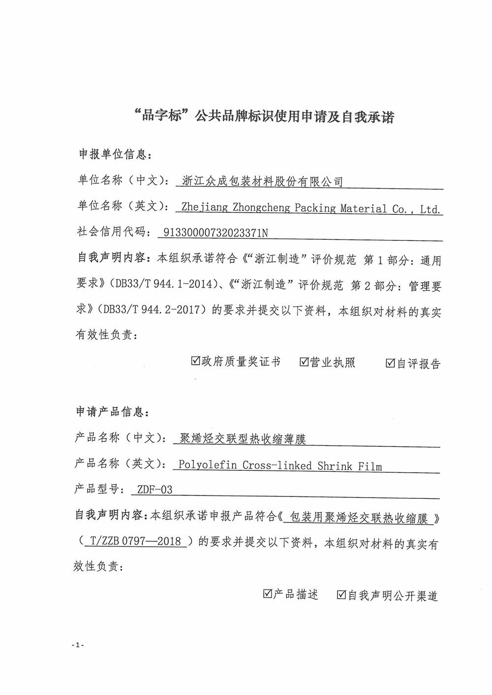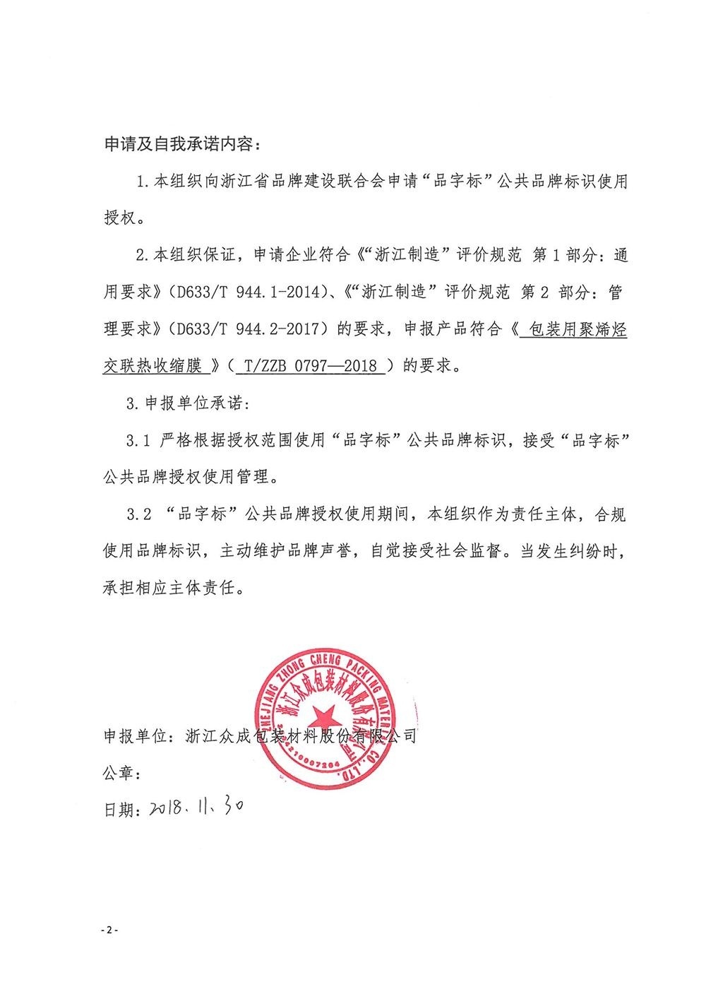 “品字标”公共品牌标识使用申请及自我承诺 2018-11-30 09:54:51 浙江众成包装材料股份有限公司 浏览次数 7911 上一条浙江众成“学党史,忆初心”主题党日活动 下一条关于投资建设“高性能功能性聚丙烯薄膜试制项目”