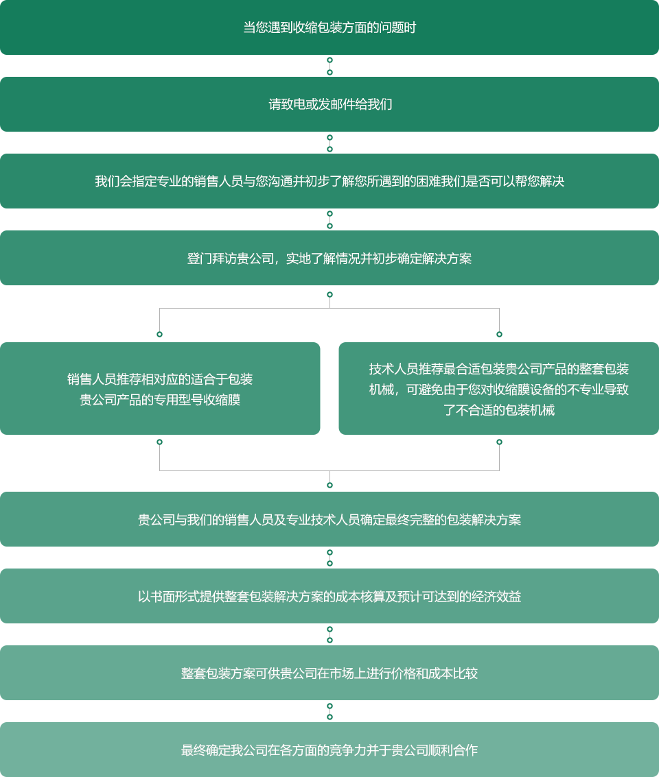 如果您想完美的使用收缩包装,那么请联系我们,我们将根据您的需求提供免费的、专业的整体包装解决方案及完善的一站式服务。