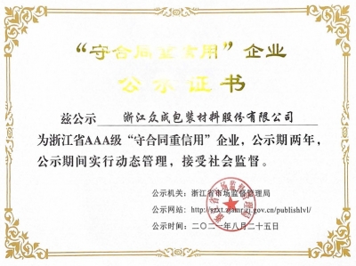 2021 AAA守合同重信用企业证书
